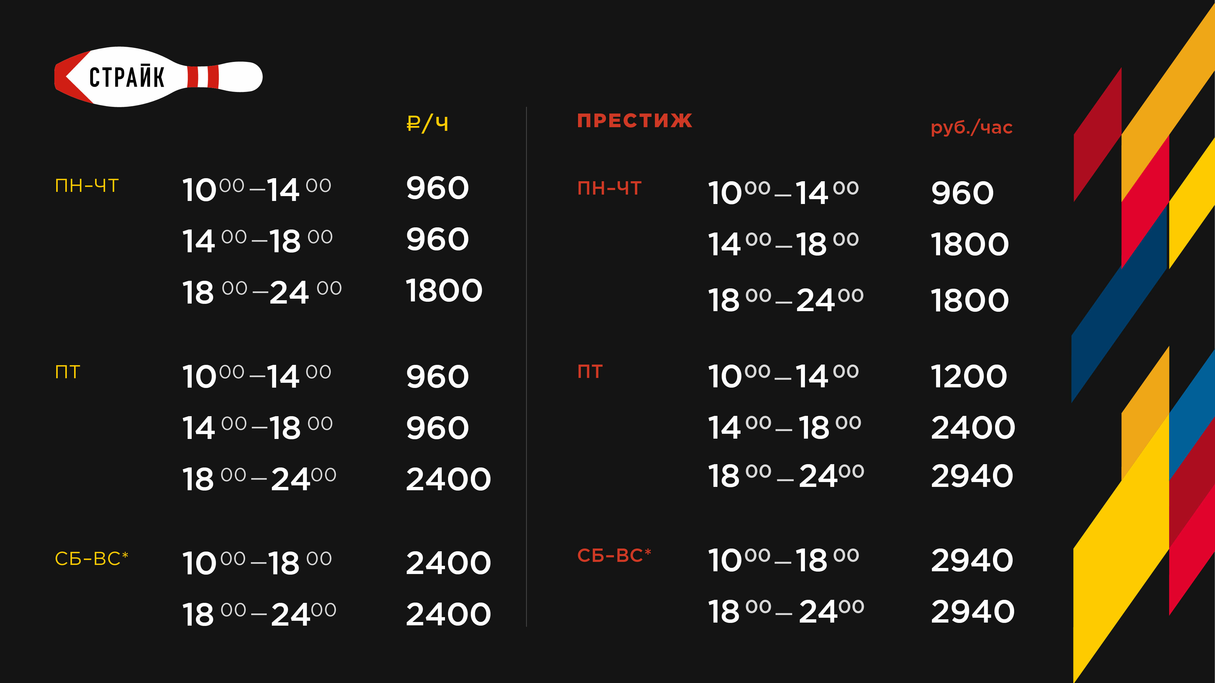 Боулинг-центр «КАРО Страйк» на 12 дорожек +7 (966) 019 12 75 (время работы: с 10:00 до 00:00 ежедневно) - Услуга игры в боулинг предоставляется по предварительной записи (брони) по телефону +7 (966) 019 12 75, либо на стойке Боулинга. - В случае наличия свободных дорожек, посещение Боулинга возможно в порядке живой очереди. При наличии посетителей, ожидающих своей очереди, продление игрового времени за пределами ранее забронированного невозможна. - Любые изменения брони принимаются минимум за сутки до начала игры. - В случае опоздания посетителей бронь держится не более 20 минут, затем снимается. При этом продление периода игры на время опоздания не производится. ПРЕЙСКУРАНТ ЦЕН НА ИГРУ В БОУЛИНГ